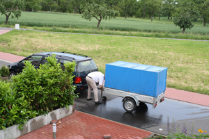 Ach ja, unseren Hänger, den wir uns bei Baubeginn zugelegt hatten, haben wir Mitte Juni verabschiedet! Ehrlich gesagt, haben wir ihn schon länger nicht mehr wirklich gebraucht und irgendwie sah er auf dem Standplatz vor dem Haus auch immer ziemlich häßlich aus. Und da ich sowieso auch meinen Jazz ersetzen wollte und wir dann kein Fahrzeug mit Anhängerkupplung mehr gehabt hätten, haben wir die Gelegenheit genutzt, dass wir jemanden an der Hand hatten, der einen kleinen Hänger suchte. Bye, bye, Kleiner - Du hast uns gute Dienste geleistet! Ohne Dich wäre alles wesentlich schwieriger gewesen und Du hast tapfer alle Lasten geschluckt, die wir Dir aufgeladen haben... Dank Lieferservice der meisten großen Baumärkte sollte er uns hoffentlich nicht irgendwann mal fehlen...