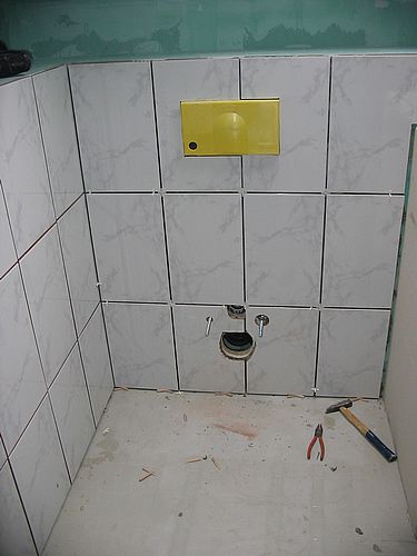 Die beiden mittleren Fliesen unten waren am schwierigsten... ...und leider ging die Größenverstellung des Lochschneiders nach genau drei Löchern kaputt - die Schraube ist einfach abgerissen! Da hier sowieso das WC davorhängt und noch eine Schallschutzmatte davor kommt, haben wir für die rechte Schraube einfach das größere Loch gebohrt, welches als letztes eingestellt wurde... 08.07.07 Bild 24 von 25 |