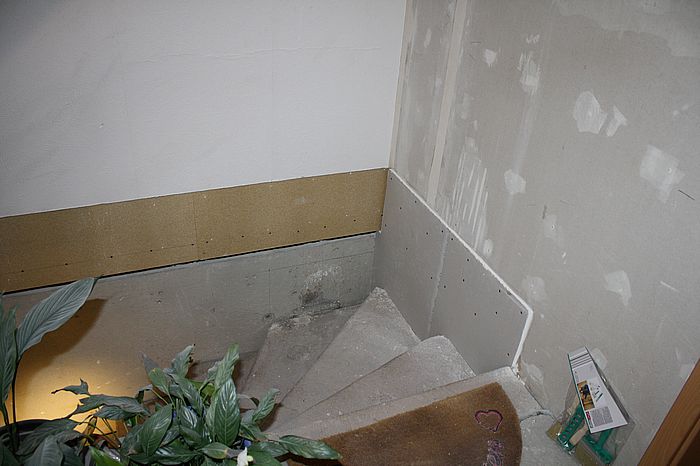 Der Treppenabgang zum Keller - unser größtes Sorgenkind! Die von unten kommenden Platten müssen exakt auf die vor vier Jahren angebrachten Platten des Erdgeschosses passen - doch die Abstände sind überall unterschiedlich! Eine extrem knifflige Geschichte, um die wir uns lange Gedanken gemacht haben... 25.04.2010 Bild 19 von 28 |