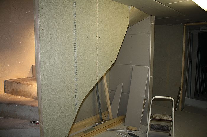 Zwei neue Wände schaffen eine schöne Nische unter der Kellertreppe - hier soll später unser Weinregal hin Die Rundung der Kellertreppe genau zu beplanken war nicht einfach. Aber dank einer neuen Mini-Handkreissäge wesentlich leichter als befürchtet... 25.04.2010 Bild 22 von 28 |