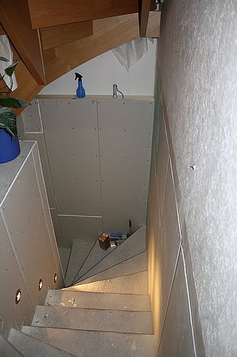 Den Übergang zwischen vorhandener EG-Beplankung und der Beplankung an der Kellertreppe war sehr schwierig Die Kellerwand an der Treppe verläuft nicht parallel mit der Wand im EG. Mit einem normalen Wandaufbau wäre somit ein deutlicher Absatz entstanden. Beim Unterbau mussten somit genau angepaßte Latten verwendet werden, damit ein ebener Übergang entsteht. An der Außenwand war das allerdings nicht möglich, da die Kellerwand hier etwa zehn Zentimeter nach innen überstand. Wir haben das mit einem Absatz gelöst, auf den später ein buchefarbenes Regalbrett kommt... 30.04.2010 Bild 27 von 28 |
