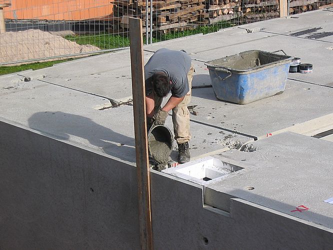 Während vorne noch die Decke geschlossen wird, werden hinten bereits die Fugen ausgegossen