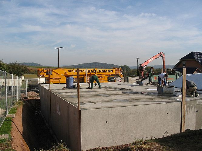 Während der Kran sich zusammenfaltet und verabschiedet, werden auf der Decke noch alle Fugen und Ritze verschlossen